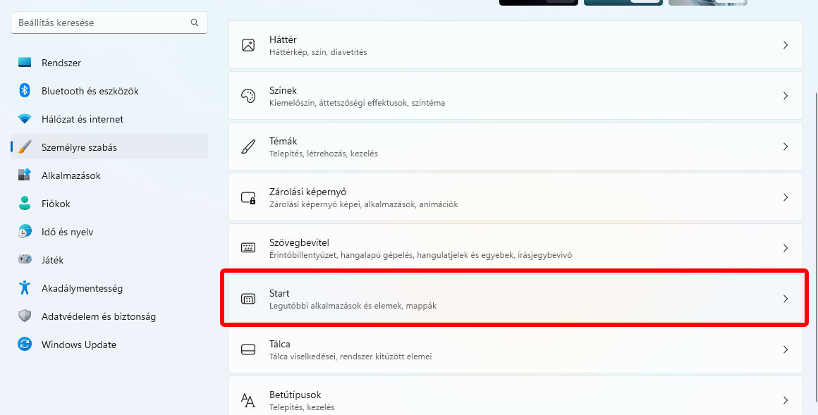 Kattints jobb egérgombbal a start menüre, és nyisd meg a Gépházat, vagy egyszerűen nyomd meg a WINDOWS+I billentyűkombinációt. Itt válaszd ki a személyre szabást, majd a Start menübe navigálj.
