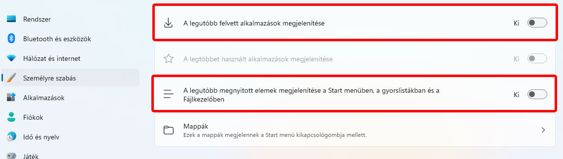 1. Az új ajánlott szegmens kikapcsolása a start menüben.