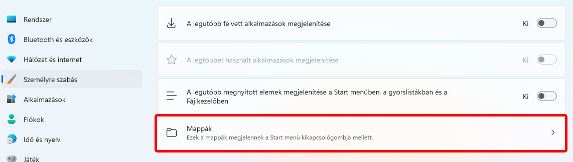 Ha már itt vagyunk, van még egy beállítás, amit érdemes átböngészni. Ha rákattintasz simán a start menüre, akkor az alsó sorban csak a kikapcsoló gombot látod, pedig itt el tudsz helyezni jópár hasznos gyorsindítót. Ehhez ugyanitt maradva, (Gépház – Személyre szabás – Start) a Mappák menübe kell bekattintanod, és itt kiválaszthatsz jópár gyorsindítást, amit bekapcsolva rögtön elérsz a Start menü aljából.