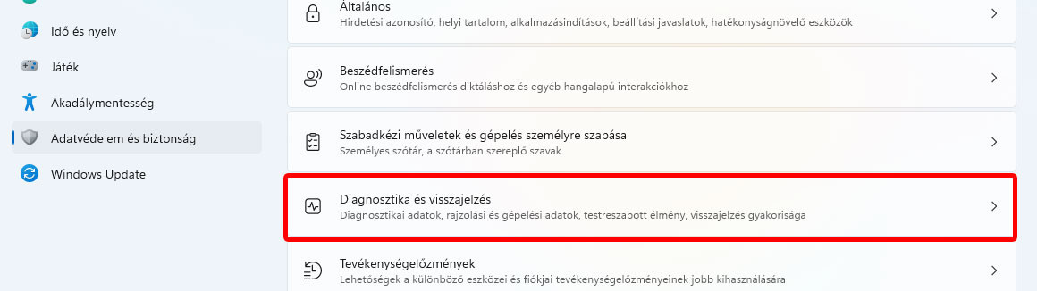 A következő virágnyelven megfoglamazott adatgyűjtési beállítás még mindig itt az Adatvédelem és biztonság menüben található meg, ez pedig a Diagnosztika és visszajelzés.
