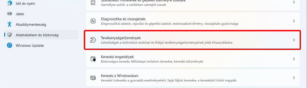 Végül, de nem utolsó sorban, a Tevékenységelőzmények menüpontot is válasszuk ki az Adatvédelem és biztonság főmenüben, majd itt is érdemes mindkét beállítást kikapcsoltra állítani. Egyrészt semmi szükség az előzmények helyi gépen történő tárolására, arra meg végképp, hogy ezeket elküldjük a Microsoft-nak.