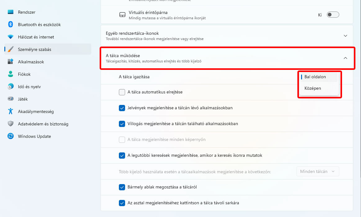 Ebben a menüben további hasznos beállításokat találsz, amiket érdemes átnézni, és ki vagy bekapcsolni, hogy neked megfelelően szabd személyre a tálca működését.