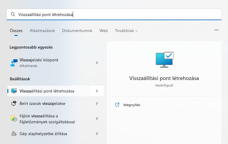 11. Rendszervisszaállítási pont létrehozása
