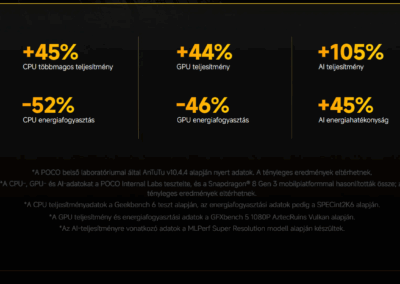 Ha szereted a tartalmakat nemcsak nézni, hanem átélni is, a Poco F7 Ultra AI Super Cinema funkciója lesz a kedvenced. A mesterséges intelligencia minden képkockát optimalizál, a két sztereó hangszóró pedig térhatású, moziszerű hangélményt nyújt. A Hi-Res Audio és a Snapdragon Sound támogatás garantálja, hogy a zenék és filmek épp úgy szólnak majd, ahogy azt a készítők megálmodták.